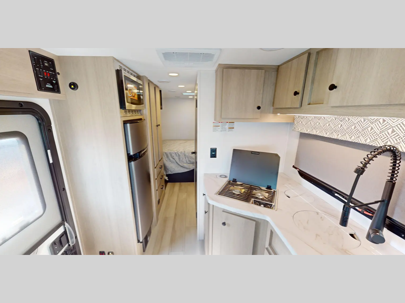 Sleeps 3 Length 25 ft 6 in Ext Width 7 ft 3 in Ext Height 10 ft 5 in GVWR 10360 lbs Fresh Water Capacity 35 gals Grey Water Capacity 30 gals Black Water Capacity 30 gals Generator 2.8 kW Onan Gas Fuel Type Gasoline Engine 3.5L EcoBoost V6 Chassis Ford Transit AWD Fuel Capacity 25 gals Wheelbase 178 in Available Beds Full Refrigerator Type LP/Electric 110V Refrigerator Size 5.3 cu ft Convection Cooking Yes Shower Size 24" x 32" Number of Awnings 1 Axle Weight Front 4130 lbs Axle Weight Rear 7275 lbs LP Tank Capacity 41 lbs Water Heater Type Truma Combi AC BTU 13500 btu TV Info LR 12V LED TV Awning Info Power with LED Lights Gross Combined Weight 13500 lbs Shower Type Standard Electrical Service 30 amp Similar Floorplans